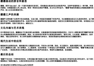 哗哗的拼音是什么?哗哗,这个词语在汉语中常用来形容水流湍急或人群嘈杂的声音。其拼音是“huā huā”。在汉语拼音体系中,“hua”代表的是声母“h”与韵母“ua”的结合,而这里的“ua”实际上是一个完整的韵母结构,包含了介音“u”和主要元