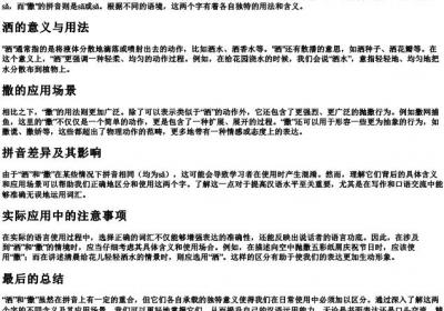 洒的拼音和意思洒,读作sǎ,这个字在汉语中有着丰富的含义与用法。它最直接的意思是将液体分散地落下,例如浇水、洒水等日常活动。这种行为既可以指人们为了清洁、灌溉或降温而进行的动作,也可能是出于艺术创作的目的,比如泼墨山水画中的“洒墨”。“洒”