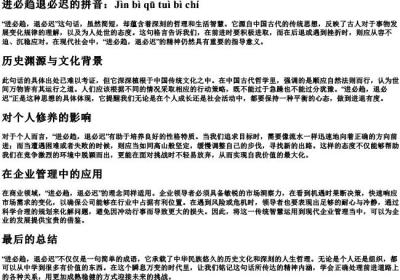 进必趋退必迟的拼音:Jìn bì qū tuì bì chí“进必趋,退必迟”这句话,虽然简短,却蕴含着深刻的哲理和生活智慧。它源自中国古代的传统思想,反映了古人对于事物发展变化规律的理解,以及为人处世的态度。这句格言告诉我们,在前进时要积