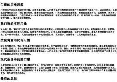 贴门帘的拼音:tie men lian“贴门帘”这个词组在普通话中的拼音为“tiē mén lián”。这是一个与传统家居装饰和文化习俗密切相关的词汇,尤其在中国北方地区较为常见。门帘作为家庭生活的一部分,不仅具有实用性,还承载着深厚的文化