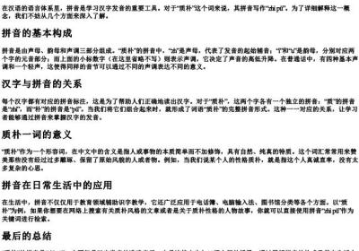 质朴的拼音怎么写的拼音在汉语的语言体系里,拼音是学习汉字发音的重要工具。对于“质朴”这个词来说,其拼音写作“zhì pǔ”。为了详细解释这一概念,我们不妨从几个方面来深入了解。拼音的基本构成拼音是由声母、韵母和声调三部分组成。“质朴”的拼音