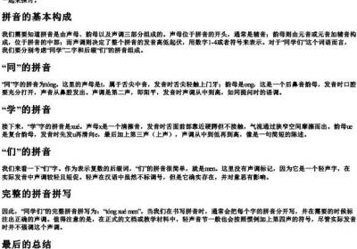 同学们的拼音信息详情在学习汉语的过程中,拼音作为汉字的标准音标系统,对于帮助学生正确发音和记忆汉字起到了至关重要的作用。拼音不仅是连接汉字与发音的桥梁,也是学习汉语的重要工具之一。本篇介绍将聚焦于同学们在学习过程中所遇到的拼音信息详情,旨在
