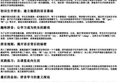 七上人教版第11课生字的拼音在七年级上册的人教版语文教材中,第十一课的内容旨在帮助学生扩展词汇量,同时深化对汉语拼音的理解。汉语拼音是学习中文的一个重要工具,它不仅帮助初学者正确发音,也是掌握汉字读音的关键。本课所涵盖的生字,通过其拼音形式