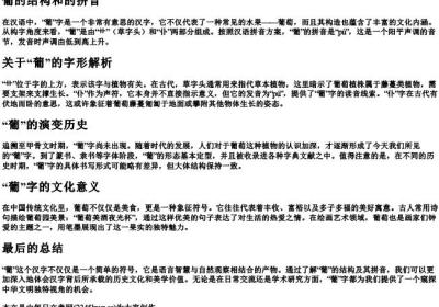 葡的拼音组词在汉语中,“葡”字通常与葡萄有关,而其拼音“pú”则可以组成多种词汇和表达。本文将探索以“葡”字开头或包含“葡”的一些有趣词语,以及它们背后的文化意义。葡萄及其衍生最直接的联想当然是“葡萄”(pú táo),这种水果在中国有着悠