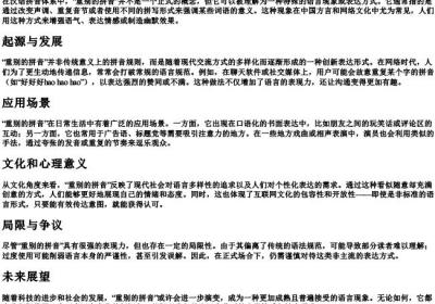 重别的拼音:一种独特的语言符号在汉语拼音体系中,“重别的拼音”并不是一个正式的概念,但它可以被理解为一种特殊的语言现象或表达方式。它通常指的是通过改变声调、重复音节或者使用不同的拼写形式来强调某些词语的意义。这种现象在中国方言和网络文化中尤