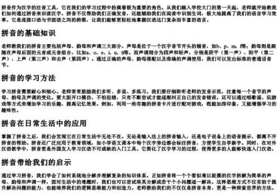 老师教大家念书的拼音怎么写在学习汉语的过程中,拼音作为汉字的音标系统,起着非常重要的作用。它不仅帮助我们准确地发音,还是连接汉字与口语之间的桥梁。对于许多初学者而言,掌握拼音是进入汉语世界的第一步。因此,今天我们就来详细探讨一下,老师是如何