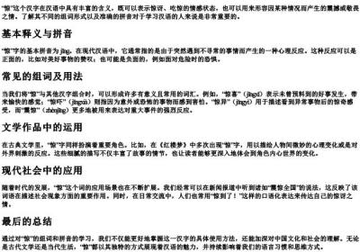惊的组词和拼音“惊”这个汉字在汉语中具有丰富的含义,既可以表示惊讶、吃惊的情感状态,也可以用来形容因某种情况而产生的震撼或敬畏之情。了解其不同的组词形式以及准确的拼音对于学习汉语的人来说是非常重要的。基本释义与拼音“