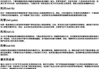 托组词的拼音在汉语学习中,了解和掌握词语的正确拼音是基础也是关键的一部分。所谓“托组词”,这里并非指一个具体的语言学术语,而是以“托”字开头的一系列词语的组合。下面将介绍一些常见的以“托”字开头的词汇及其拼音,帮助大家更好地理解和记忆。托付