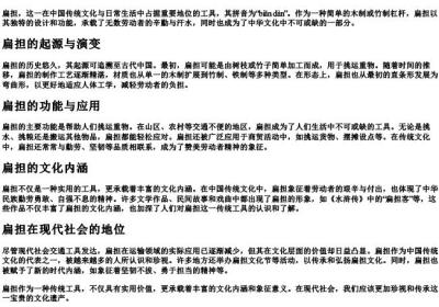 扁担怎么造句扁担是一种中国传统的搬运工具,由两根竹子或木头组成。扁担有许多种用途,不仅被用作搬运物品,还可以被用作武器。今天我们来探讨一下如何用扁担造句。造句的方法要用扁担造句,首先我们需要了解一些汉字的意思。在汉语中,“扁”意思是“平的”