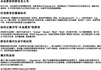 永远的拼音怎么写“永远”这个词在汉语中表示时间上无尽头,长久不变的意思。它由两个汉字组成:“永”,意味着长久;“远”,表示距离上的遥远或时间上的长远。在汉语拼音中,“永远”的拼音写作“yǒngyuǎn”。其中,“永”的拼音是“yǒng”,而