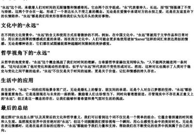 永远怎么拼“永远”这个词,承载着人们对时间的无限憧憬和情感寄托。它由两个汉字组成,“永”代表着持久、长远,而“恒”则强调了不变与持续。这两个字合在一起,形成了一个表达长久不变之意的概念。无论是在爱情中承诺对方的永恒之爱,还是在友谊里许下的长