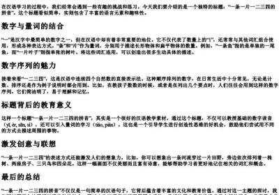 一片字拼音怎么写的在学习汉字的过程中,我们不可避免地会遇到如何用拼音表达某些复杂概念或特定词语的情况。其中,“一片”这个词组虽然简单,却有着丰富的含义和用法,它不仅用于描述物理上的“片状物”,还可以用来形容抽象的概念,比如情感、景象等。本文