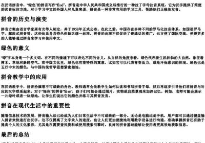 绿色的拼音手机上怎么拼:引言在当今数字化的时代,智能手机已经成为我们生活中不可或缺的一部分。而随着科技的进步,手机的功能也日益多样化,其中输入法作为人机交互的重要工具,其便利性和智能化程度也在不断提高。对于中文用户来说,拼音输入法是最为常用