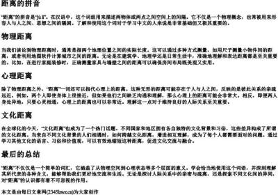 距离的拼音“距离”的拼音是“jùlí”。在汉语中,这个词组用来描述两物体或两点之间空间上的间隔。它不仅是一个物理概念,也常被用来形容人与人之间、思想之间的隔阂。了解和使用这个词对于学习中文的人来说是非常基础但又极其重要的。物理距离当我们谈论