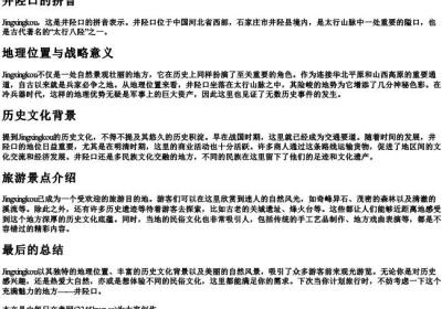 井陉口的拼音Jingxingkou,这是井陉口的拼音表示。井陉口位于中国河北省西部,石家庄市井陉县境内,是太行山脉中一处重要的隘口,也是古代著名的“太行八陉”之一。地理位置与战略意义Jingxingkou不仅是一处自然景观壮丽的地方,它在历
