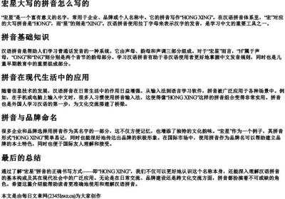 宏星大写的拼音怎么写的“宏星”是一个富有意义的名字,常用于企业、品牌或个人名称中。它的拼音写作“HONGXING”。在汉语拼音体系里,“宏”对应的大写拼音是“HONG”,而“星”的则是“XING”。汉语拼音使用拉丁字母来表示汉字的发音,是学